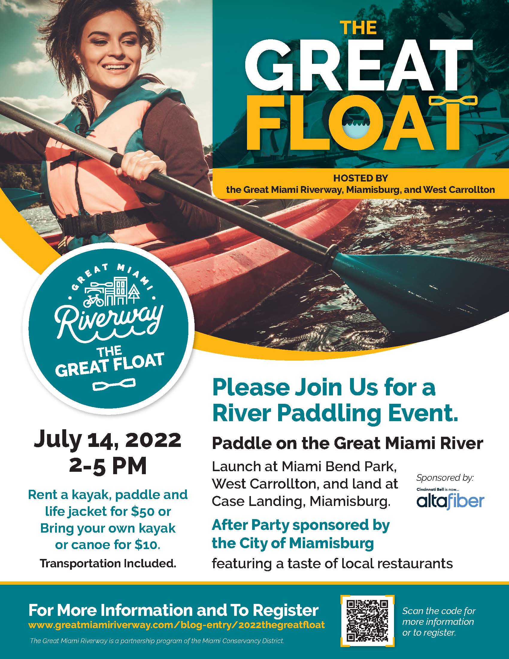 Calling all paddlers! Everyone is invited to the 2022 GREAT Float - a celebration of the Great Miami River. Join us on a 5-mile paddle from West Carrollton to Miamisburg with over 100 participants in canoes, kayaks, and other human-powered craft.