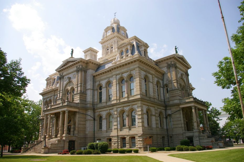 Shelby County Courthouse - the 1880's French Second Empire style building is composed of four symmetrical sides, with projecting pavilions at the entries, and a classical mansard roof. It features a 170 foot center tower of galvanized iron, with four clocks. A bell, which was placed in the courthouse after its completion, still hangs there today.