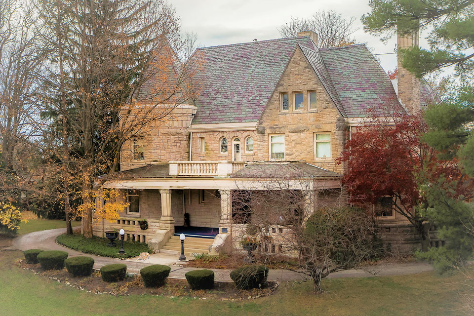 The GreatStone Castle -- now a charming bed & breakfast and spa -- has overlooked downtown Sidney for 125 years. It is constructed of 18 inch thick Bedford, Indiana, limestone and features a wrap around porch supported by intricate stone columns. Three turrets give this massive structure its castle-like appearance. The detailed interior design features rare carved and machined hardwoods from many countries, transported by ship and rail.