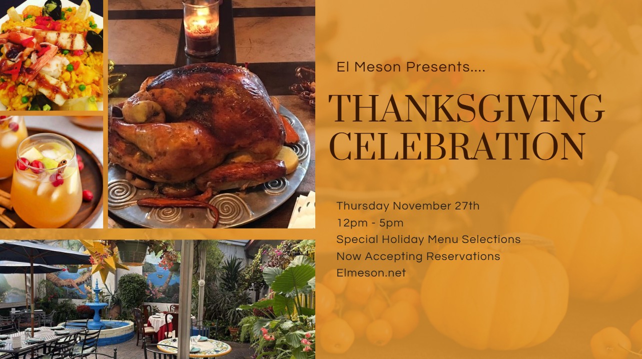 Dine-in and carry-out available. Featuring a unique tequila marinated turkey with cranberry jalapeno salad, three root mash, roasted Mexican corn, chorizo stuffing, and butterscotch pumpkin bars.