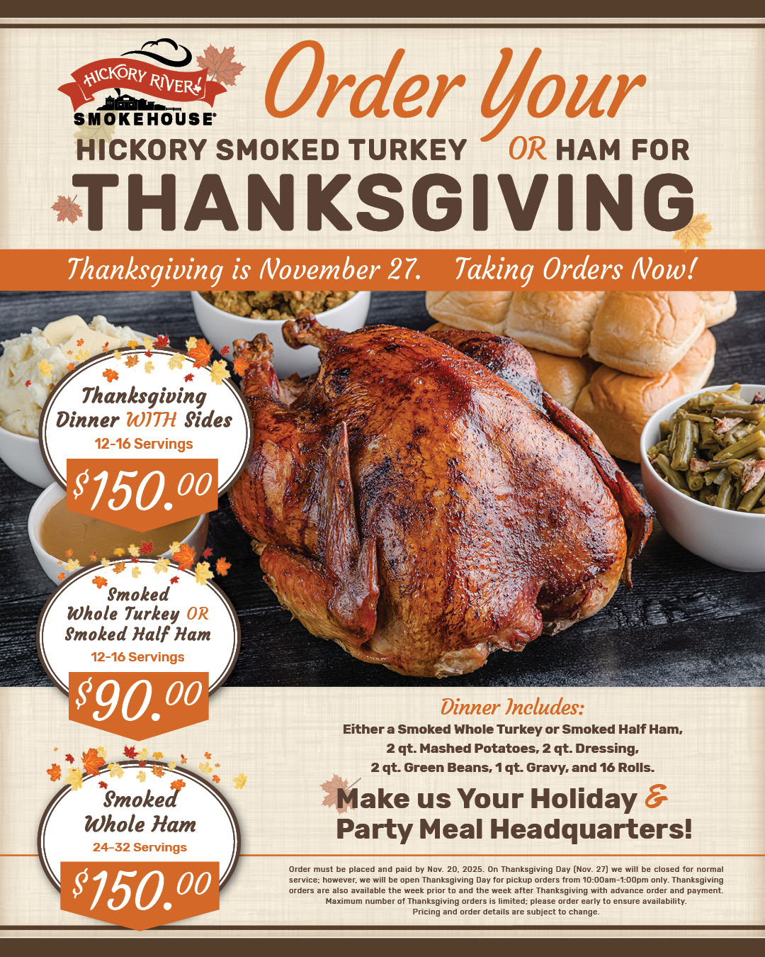 Options include smoked whole turkey or smoked half ham, mashed potatoes, dressing, green beans, gravy, and rolls.