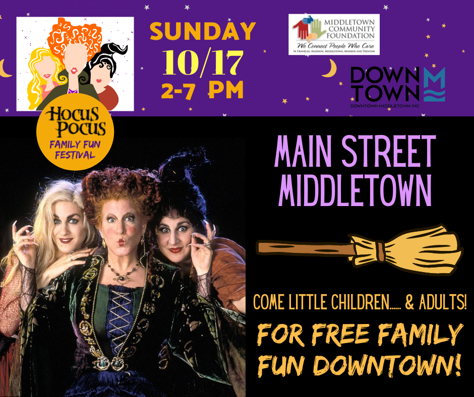 - Hocus Pocus Halloween is putting a spell on you and has lots of free, family fun! Come run "amuck, amuck, amuck" with us in downtown Middletown on Sunday, October 17th for THE family fun festival of the season! Join the Sanderson Sisters outside on S. Main Street (between Central Ave & 1st Ave) from 2 p.m. to Dusk. Enjoy Hocus Pocus themed fun, food & craft vendors, dance troupes, magic & illusion show, pumpkin carvers, meet Binx the cat, fun music, Howl-o-ween dog costume contest & parade, kids games and activities and more!