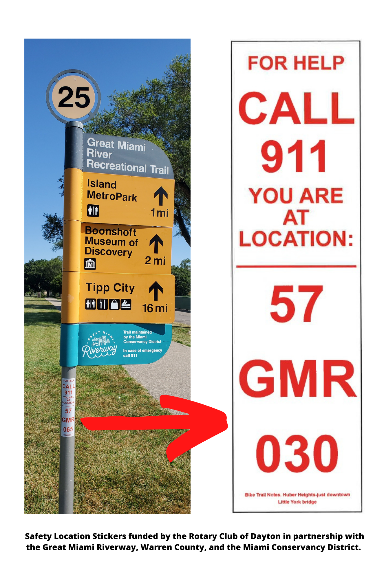 Funded by the Rotary Club of Dayton, this project was implemented by the Miami Conservancy District. Thanks to emergency responders in the City of Franklin and Warren County, the numbering system is now part of the Dispatch database, just like a street address. Each bike trail sign post was assigned a unique number, and each sign post is geo-located so they can navigate to you more quickly.
