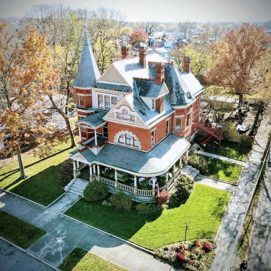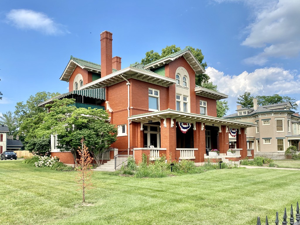 The Shuler Mansion is a Prairie style home with Italian Renaissance details built in 1910. The 8200 sq ft interior features a Rookwood Fireplace, quartered oak molding, leaded windows, and a a solid mahogany beamed ceiling. There are 22 rooms including 6 bathrooms. Be sure to note the 1913 Food high water marker on the porch.