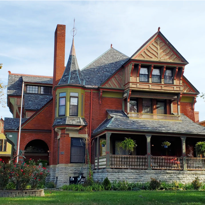 The Benninghofen House, the most well-known, was built by Hamilton’s first and most famous architect, Max Reutti, in the Queen Anne Style. The interior features an oak library, parquet floors, an elaborate staircase & 9 fireplaces. The home is now a boutique hotel and small event venue, offering public events throughout the week like group yoga or massage.