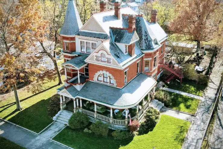 The Benninghofen House has 4 full apartments available for rent with a grand front porch, lush backyard, fire pit, outdoor grill, tree fort, swing set, and ping pong table. The homeowner is a Yoga instructor and offers private sessions for her AirBnB guests. The units have many unique features like extensive woodwork, fireplaces, stained glass windows, and are filled with the usual amenities.