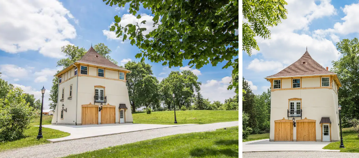 The Romantic Guest House sits on the historical Orrmont Estate in Piqua, OH. While the Guest House is new (2019), it is built in the beautiful old world style with stucco exterior to match the other buildings on the Estate. The Guest House overlooks the spring fed pond filled with Koi and is nestled in right by the woods that used to be the home of a quarter mile race track in days gone by.