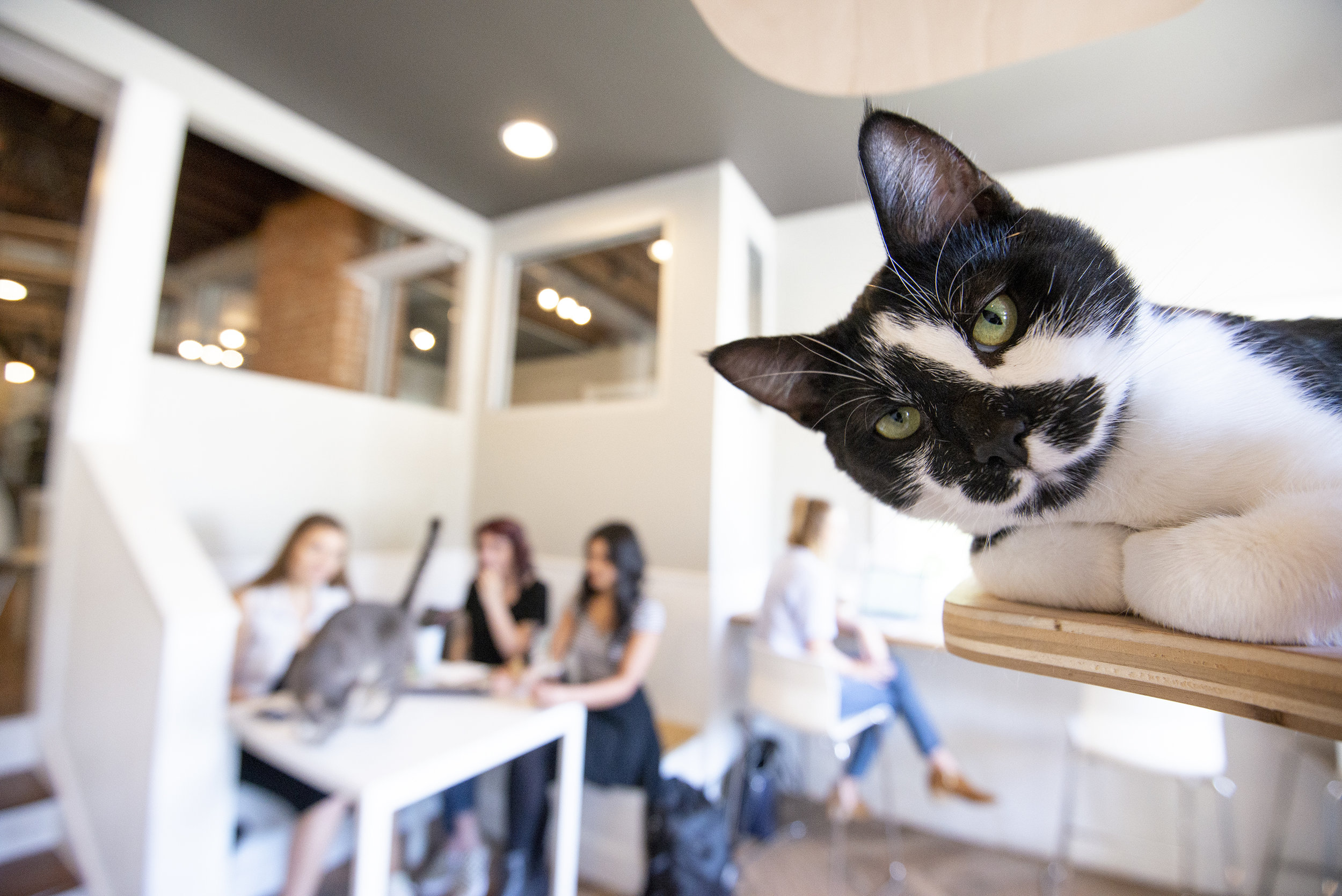 A cafe with cats? ...Oh yeah. Our new layout features three areas: the cat lounge, the cafe seating, and the upstairs art gallery space. We have separate air systems for the cat lounge so that even people with allergies can visit. Gem City Catfe was started to advocate for rescue cats and animal welfare with a new approach. We wanted to create an approachable and enjoyable atmosphere that would be welcoming to those new to the rescue scene as well as educational for others looking to get more involved.